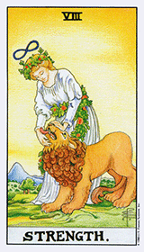 1. The traditional Strength card depicts a woman taming a lion (the primal, baser instincts) through her grace and purity. Of course, here we see Harry "taming" his Patronus, which requires overcoming his fears and acknowledging his magical potential, etc etc.