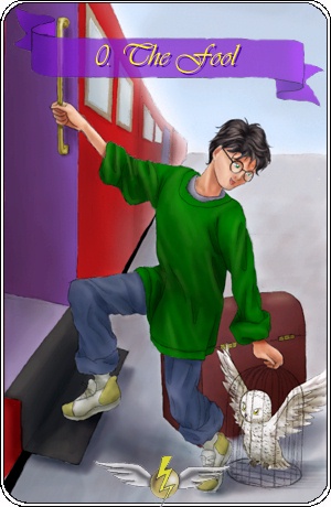 1. The traditional Fool is stepping off a cliff into the unknown. Harry is, of course, taking the first step onto the Hogwarts Express, going from the mundane (gray) Muggle world to the realm of magical potential (red).