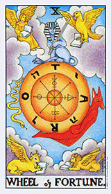 2. The traditional Wheel of Fortune card has four angelic animals/figures in the four corners, which are apparently icons of