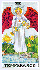 1. The traditional Temperance card has an angel pouring water between two cups to symbolize the mixing/equalizing of two forces... um, and stuff like that. Lupin is filling a goblet with the Wolfsbane Potion, which serves to temper the rage of his cursed side.