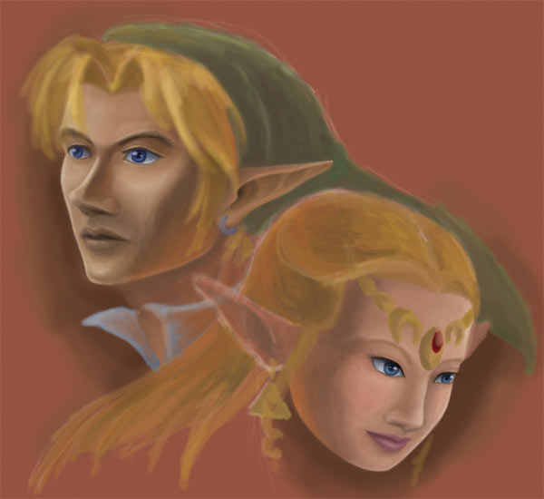 Link has emotion... he's looking far off and going "huh? should I be worried about that?". He also looks like he's 30. Zelda is... looking intently down at something. Unless that be the nether regions of Dark Link, it isn't justified. Her left eye isn't focused on the same thing has her right eye, so you have to shift one or the other over. Besides, people's eyelids naturally move down/half-close when they're looking down. If I were home I'd do a quick doodly thing, but alas I'm in the library.