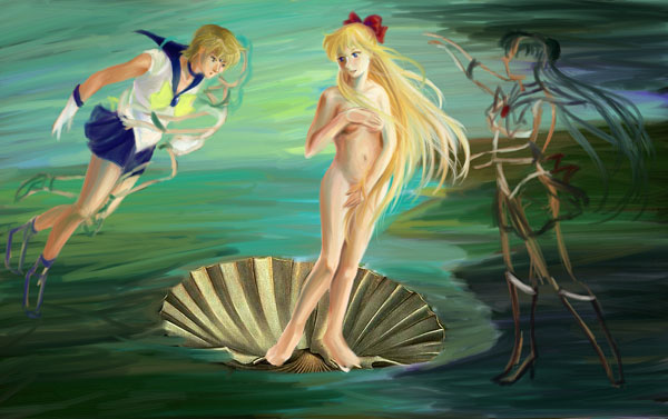 * The Birth of "Venus" in progress, for Anime Club. The Fresh Produce topic this time is "bastardization", or putting anime characters in "unlikely situations". One of the samples/inspirations provided had Naruto characters inserted into classical art, so I figured it was a good opportunity to do this (painfully unoriginal) idea that I've wanted to do but had no reason to spend the effort. =P